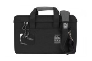 角ばった箱型の形状で、丈夫なフレームとパッドを備えたレンズバッグです。軽量で持ち運びに便利です。